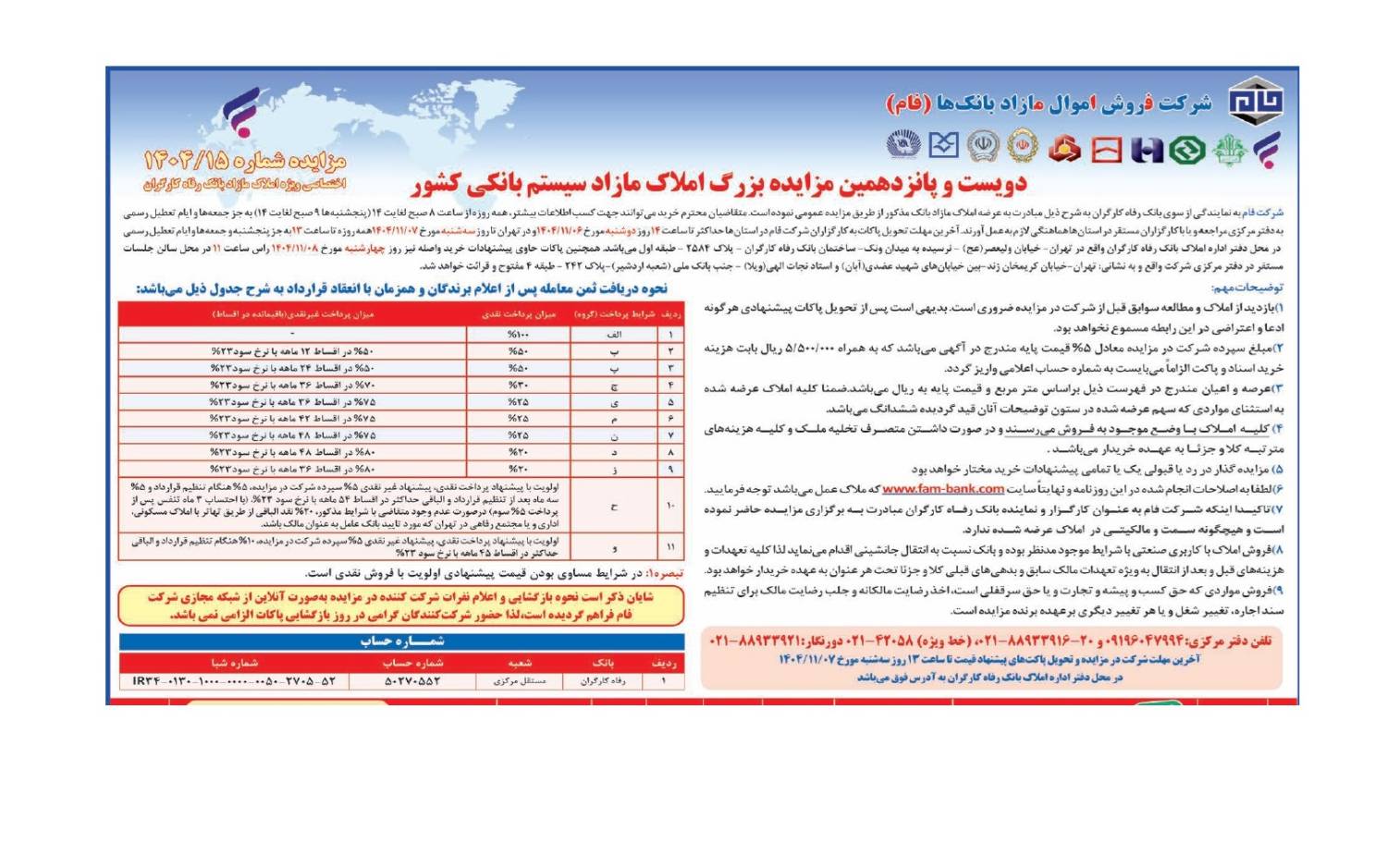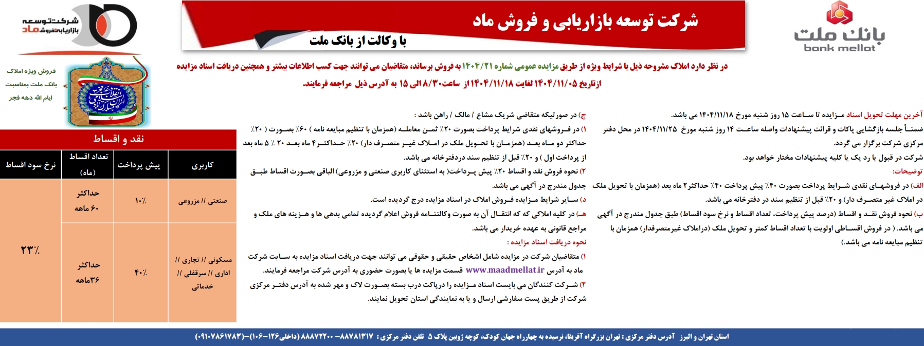 شرکت توسعه بازاريابي و فروش ماد با وکالت از بانک ملت در نظر دارد املاک مشروحه ذيل با شرايط ويژه از طريق مزايده عمومي شماره 1404/21 به فروش برساند، متقاضيان مي توانند جهت کسب اطلاعات بيشتر و همچنين دريافت اسناد مزايده ازتاريخ 1404/11/05 لغايت 1404/11/18 از ساعت8/30 الي 15 به آدرس ذيل مراجعه فرمايند. آخرين مهلت تحويل اسناد مـزايده تا سـاعت 15 روز شنبه مورخ 1404/11/18 مي باشد. ضمنـاً جلسه بازگشايي پاکات و قرائت پيشنهادات واصله ساعـت 14 روز شنبه مورخ 1404/11/25 در محل دفتر مرکزي شرکت برگزار مي گردد. شرکت در قبول يا رد يک يا کليه پيشنهادات مختار خواهد بود.