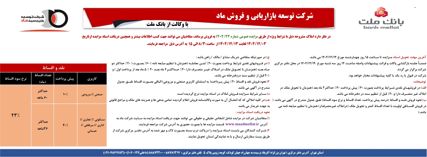 شرکت توسعه بازاريابي و فروش ماد با وکالت از بانک ملت در نظر دارد املاک مشروحه ذيل با شرايط ويژه از طريق مزايده عمومي شماره 1404/23 به فروش برساند، متقاضيان مي توانند جهت کسب اطلاعات بيشتر و همچنين دريافت اسناد مزايده ازتاريخ 1404/12/03 لغايت 1404/12/13 از ساعت8/30 الي 15 به آدرس ذيل مراجعه فرمايند. آخرين مهلت تحويل اسناد مـزايده تا سـاعت 15 روز چهـارشنبه مورخ 1404/12/13 مي باشد. ضمنـاً جلسه بازگشايي پاکات و قرائت پيشنهادات واصله ساعـت 14 روز سه شنبه مورخ 1404/12/19 در محل دفتر مرکزي شرکت برگزار مي گردد. شرکت در قبول يا رد يک يا کليه پيشنهادات مختار خواهد بود.