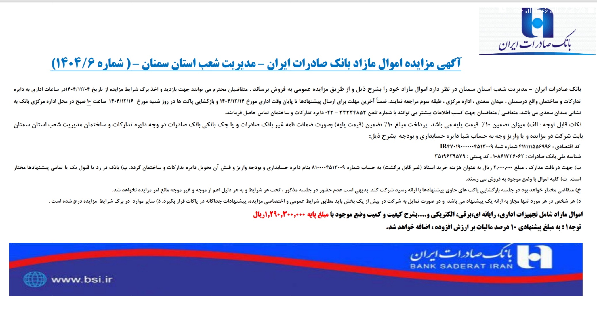 ادامهبسمه تعالي اگهي مزايده املاک و اموال تمليکي و ملکي مازاد بانک ملي ايران نوبت پنجم سال 1404 استان يزد(بشماره 05/1404) با سلام و احترام، بانک ملي ايران در نظر دارد تعدادي از اموال تمليکي و مازاد ملکي خود را از طريق مزايده الکترونيکي سامانه تدارکات دولت (ستاد ايران) به صورت "نقدي"به فروش رساند. شرايط واگذاري وحداکثر مهلت مقرر بشرح ذيل: الف) متقاضي خريد مال به صورت نقدي مي باشم / مي¬باشيم ب) متقاضي خريد مال به صورت نقد و اقساط مي¬باشم / مي¬باشيم * تاريخ برگزاري و انتشار مزايده از ساعت 08:30 روز چهارشنبه مورخ 29/11/1404 لغايت ساعت12:00 روز شنبه مورخ23/12/1404 مي¬باشد. * مهلت دريافت اسناد مزايده از ساعت 08:30 روز چهارشنبه مورخ 29/11/1404 تا ساعت 12:00 روز يکشنبه مورخ 10/12/1404 مي باشد. * مهلت ارائه پيشنهاد و شرکت در مزايده از ساعت 08:30 روز چهارشنبه مورخ 29/11/1404 لغايت ساعت 12:00 روز شنبه مورخ 23/12/1404 مي باشد. *تاريخ بازديد از املاک مورد مزايده از ساعت 08:00 سه شنبه مورخ05/12/1404 تا ساعت 12:00 شنبه مورخ 09/12/1404 مي باشد. * تاريخ بازگشايي پاکتهاي الکترونيکي ساعت 08:30 صبح روز يکشنبه مورخ 24/12/1404خواهد بود. ** هچنين مزايده مذکور در روزنامه کثسيرالانتشارسراسري( چهارشنبه مورخ 29/11/1404) و روزنامه محلي( شنبه مورخ 02/12/1404)منتشر و در پايگاه اينترنتي بانک ملي ايران( چهارشنبه مورخ 29/11/1404) قابل مشاهده خواهد بود. توجه: امکان شرکت در مزايده بدون دريافت اسناد مزايده ميسر نمي¬باشد لذا متقاضيان شرکت در مزايده حتماً مي¬بايست جهت شرکت در مزايده تا قبل از اتمام تاريخ مهلت دريافت اسناد مزايده (از ساعت 08:30 روز چهارشنبه مورخ 29/11/1404 تا ساعت 12:00 روز يکشنبه مورخ 10/12/1404) نسبت به دريافت اسناد مزايده از طريق سامانه تدارکات الکترونيکي دولت (ستاد ايران) اقدام نمايند ضمنا: سوالات احتمالي خود را در زمينه اموال مورد مزايده از شعب بانک ويا به محل اين اداره امور واقع در يزد- بلوار جمهوري اسلامي «بانک ملي ايران» اداره امور شعب استان يزد – دايره ساختمان و املاک مراجعه نمايند. شماره تلفن 36955506-035 و 36951111-035 داخلي5506 نيز جهت تماس اعلام مي گردد. توضيحات : * متقاضيان خريد مي بايست مبلغ 11.400.000(يازده ميليون و چهارصد هزار) ريال براي در اختيار گرفتن اسناد مزايده بابت هر ملک، بايد وجه مورد نظر را به حساب شماره 0118715033005 و شماره شبا 780170000000118715033005IR به نام بانک ملي ايران – سامانه ستاد ايران (قابل واريز در کليه شعب بانک ملي) بشماره شناسه پرداخت 1700696915 واريز و تصوير رسيد پرداخت شده را در سامانه ستاد بارگذاري نمايند . متقاضيان خريد براي کسب اطلاعات بيشتر مي توانند از طريق ذيل اقدام نمايند. 1- تماس تلفني با شماره تلفن 36955506-035 و 36951111-035 داخلي5506 اعلام مي گردد. 2- مراجعه به سايت بانک ملي ايران www.bmi.ir بخش مناقصه و مزايده -آگهي مزايده عمومي/ استاني شماره 05/1404 املاک تمليکي و ملکي مازاد بانک ملي ايران 3- مراجعه به سامانه تدارکات الکترونيکي دولت "سامانه ستاد" www.setadiran.ir مزايده ? مزايده دستگاه اجرايي? مزايده گر ? مزايده شماره 2004004040000005مراجعه فرمايند. 4- مراجعه حضوري به شعب بانک ملي ايران - اداره امور شعب استان يزد بانک ملي ايران- اداره امور شعب استان يزد ليست مزايده عمومي شماره 1404/05(و ازطريق سامانه تدارکات الکترونيکي دولت "ستاد" مزايده مزايده بشماره 2004004040000005) املاک و اموال تمليکي و مازاد بانک ملي ايران نوبت پنجم سال1404 استان يزد تاريخ تنظيم : 1404/11/25 نوع مـــال نشـــاني ملک نوع ملک کاربـري "مساحت تقريبي عرصه (مترمربع)" "مساحت تقريبي اعيان (مترمربع)" "پلاک ثبـتي " "وضعيت کنوني " توضيـحـات مال "مبلغ پايه مزايـــده (ريال)" شرايط فروش تمليکي تفت - نصرآباد - مزرعه حسين آباد(تمليکي از شرکت مرغ گوشتي رزاق نصراباد) ساختمان خارج از طرح هادي و وضع موجود مرغداري مي باشد 19998 6900 يکفرعي از 178 اصلي بخش 14 يزد متصرفدار مورد مزايده 1.426.265.251سهم از 8.693.280.000 سهم مشاع از مرغداري شامل ساختمان سالن هاي مجزي و انبار اذوقه و اتاق کارگري با مصالح بنايي و ديوار باربر اجري 