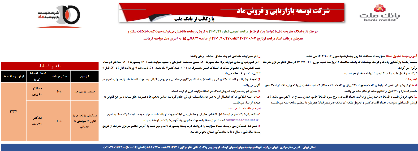 شرکت توسعه بازاريابي و فروش ماد با وکالت از بانک ملت در نظر دارد املاک مشروحه ذيل با شرايط ويژه از طريق مزايده عمومي شماره 1404/19 به فروش برساند، متقاضيان مي توانند جهت کسب اطلاعات بيشتر و همچنين دريافت اسناد مزايده ازتاريخ 1404/10/07 لغايت 1404/10/17 از ساعت 08:30 الي 15:00 به آدرس ذيل مراجعه فرمايند.