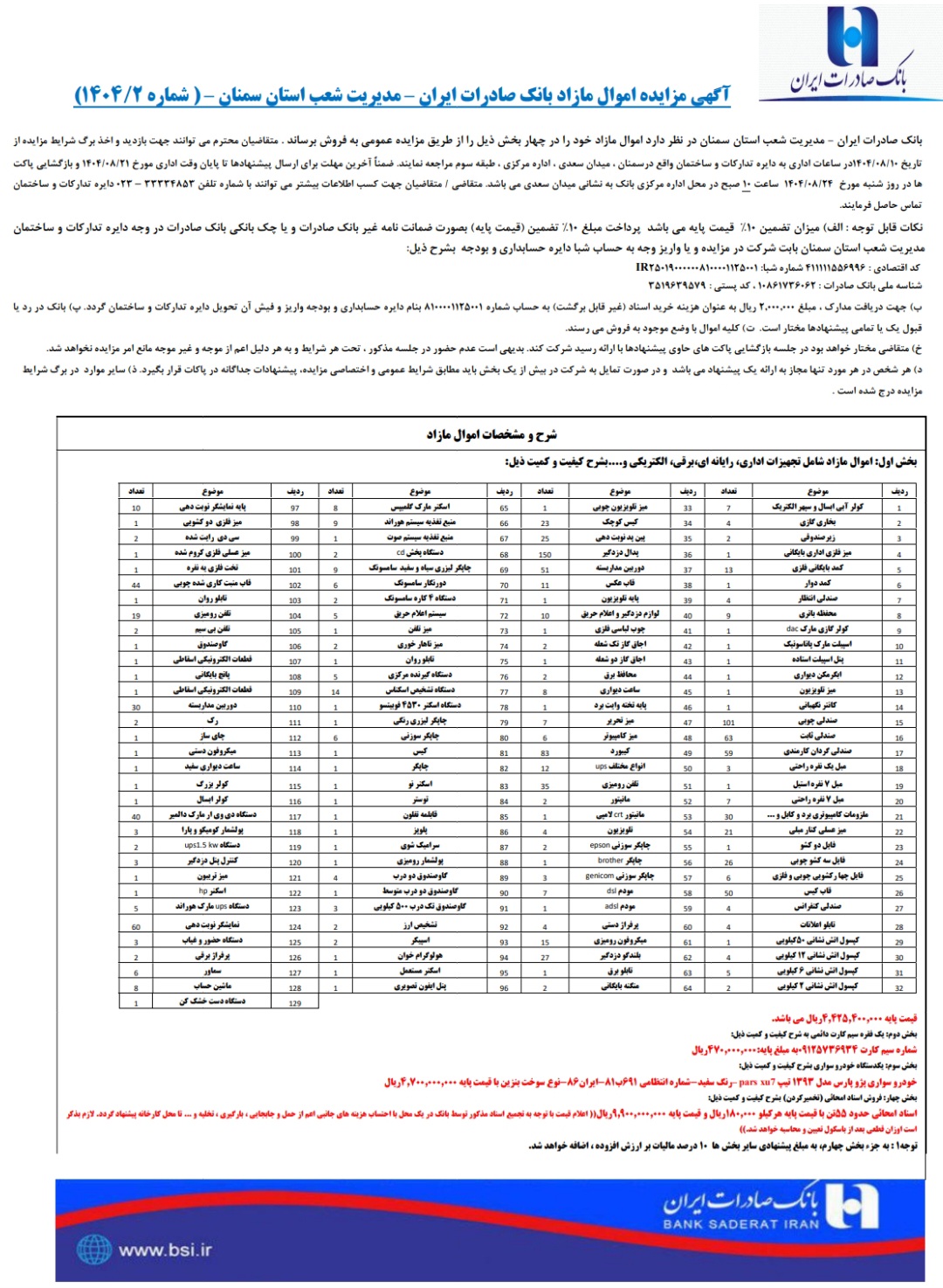 بانک صادرات ايران - مديريت شعب استان سمنان در نظر دارد اموال مازاد خود را در چهار بخش ذيل را از طريق مزايده عمومي به فروش برساند . متقاضيان محترم مي توانند جهت بازديد و اخذ برگ شرايط مزايده از تاريخ 10/08/1404در ساعات اداري به دايره تدارکات و ساختمان واقع درسمنان ، ميدان سعدي ، اداره مرکزي ، طبقه سوم مراجعه نمايند. ضمناً آخرين مهلت براي ارسال پيشنهادها تا پايان وقت اداري مورخ 21/08/1404 و بازگشايي پاکت ها در روز شنبه مورخ 24/08/1404 ساعت 10 صبح در محل اداره مرکزي بانک به نشاني ميدان سعدي مي باشد. متقاضي / متقاضيان جهت کسب اطلاعات بيشتر مي توانند با شماره تلفن 33334853 – 023 دايره تدارکات و ساختمان تماس حاصل فرمايند.