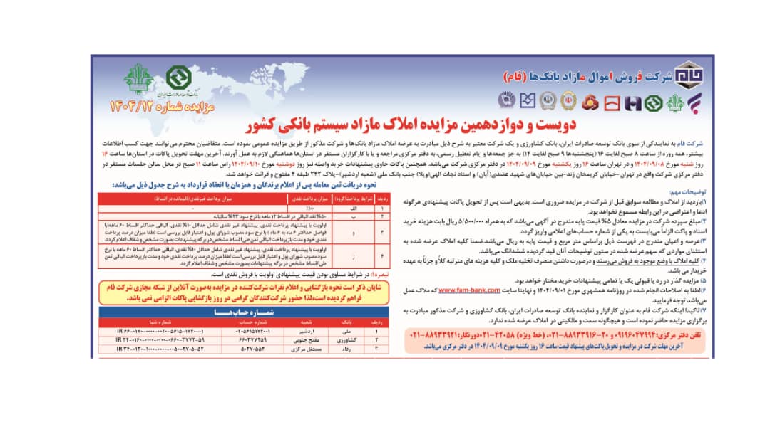 شرکت توسعه بازاريابي و فروش ماد با وکالت از بانک ملت، در نظر دارد املاک مشروحه ذيل با شرايط ويژه از طريق مزايده عمومي شماره 1404/15 به فروش برساند، متقاضيان مي توانند جهت کسب اطلاعات بيشتر و همچنين دريافت اسناد مزايده ازتاريخ 1404/08/11 لغايت 1404/08/21 از ساعت8/30 الي 15 به آدرس ذيل مراجعه فرمايند. آخرين مهلت تحويل اسناد مـزايده تا سـاعت 15 روز چهـارشنبه مورخ 1404/08/21 مي باشد. ضمنـاً جلسه بازگشايي پاکات و قرائت پيشنهادات واصله ساعـت 14 روز سه شنبه مورخ 1404/08/27 در محل دفتر مرکزي شرکت برگزار مي گردد. شرکت در قبول يا رد يک يا کليه پيشنهادات مختار خواهد بود.