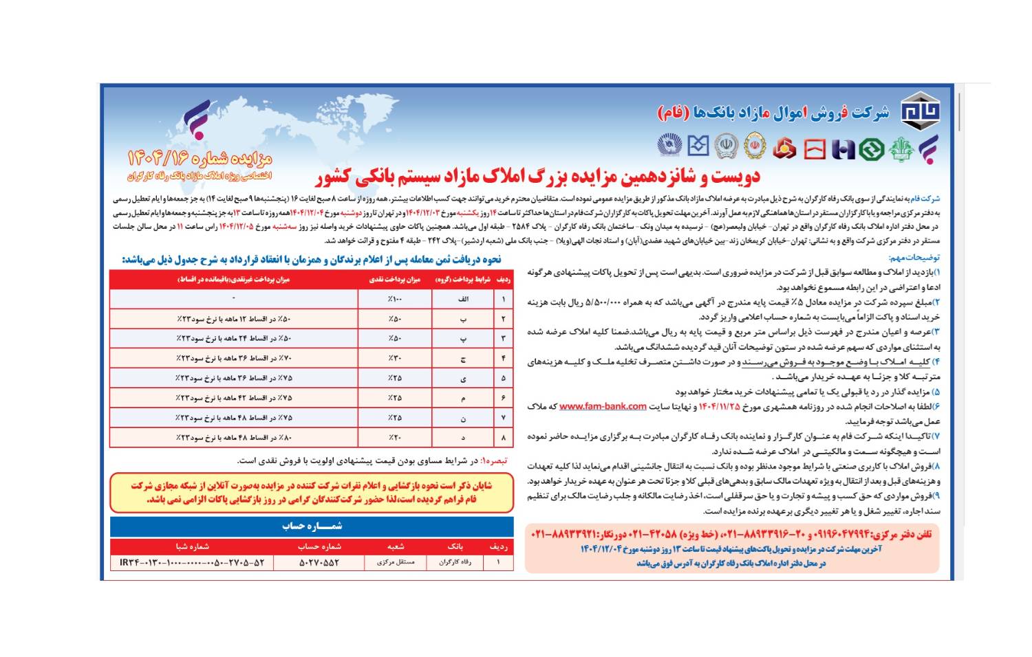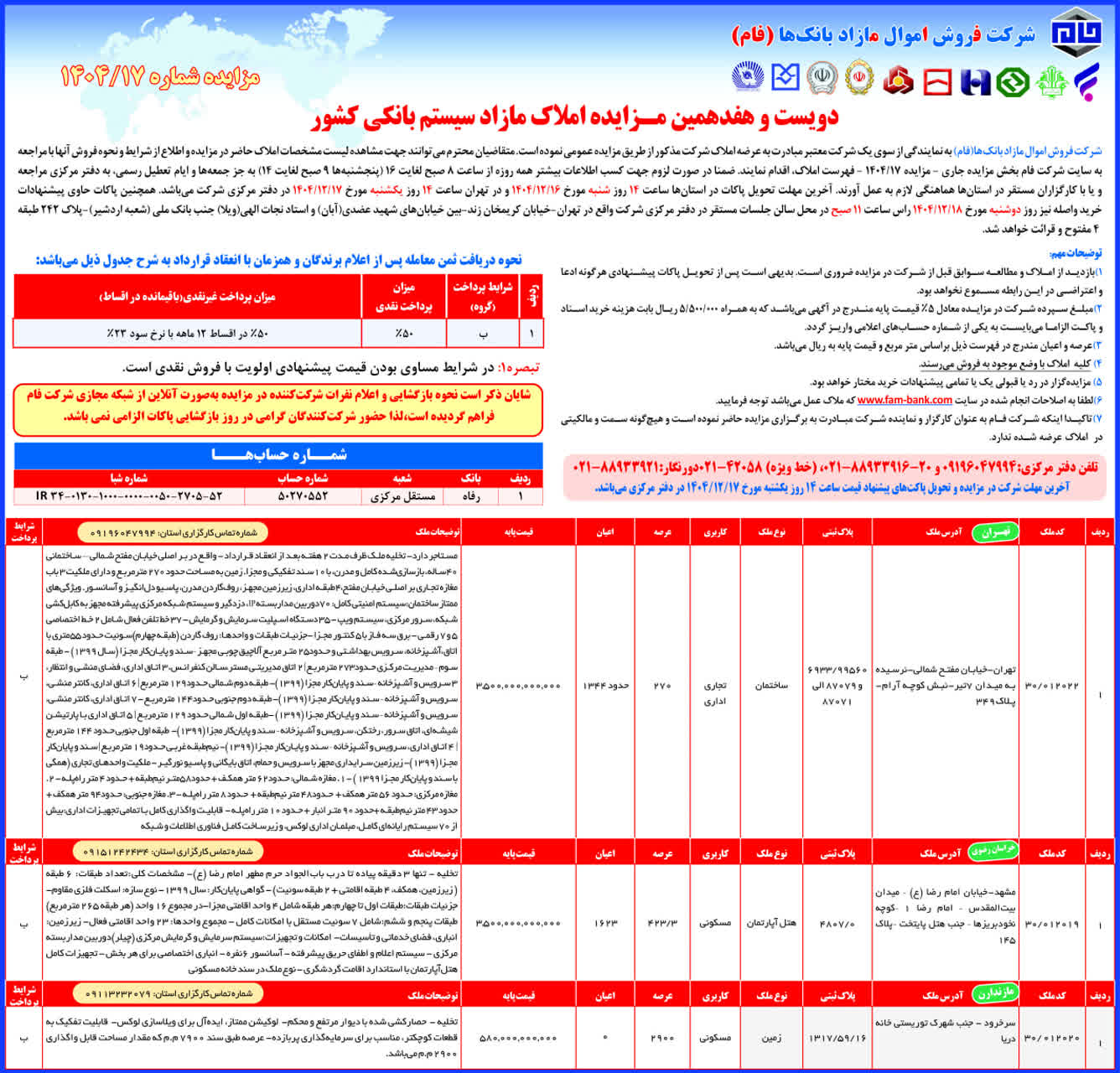 شرکت توسعه بازاريابي و فروش ماد با وکالت از بانک ملت در نظر دارد املاک مشروحه ذيل با شرايط ويژه از طريق مزايده عمومي شماره 1404/22 به فروش برساند، متقاضيان مي توانند جهت کسب اطلاعات بيشتر و همچنين دريافت اسناد مزايده ازتاريخ 1404/11/19 لغايت 1404/11/29 از ساعت8/30 الي 15 به آدرس ذيل مراجعه فرمايند. آخرين مهلت تحويل اسناد مـزايده تا سـاعت 15 روز چهـارشنبه مورخ 1404/11/29 مي باشد. ضمنـاً جلسه بازگشايي پاکات و قرائت پيشنهادات واصله ساعـت 14 روز سه شنبه مورخ 1404/12/05 در محل دفتر مرکزي شرکت برگزار مي گردد. شرکت در قبول يا رد يک يا کليه پيشنهادات مختار خواهد بود.