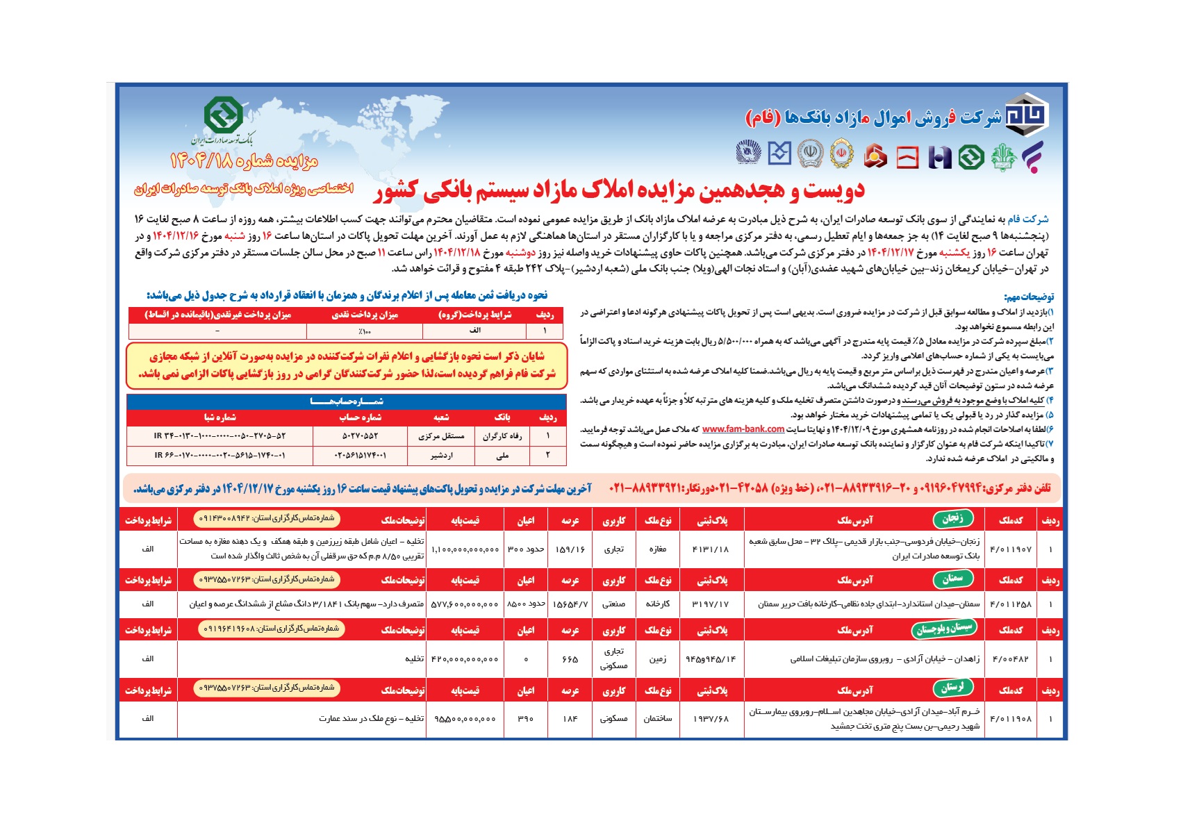 شرکت توسعه بازاريابي و فروش ماد با وکالت از بانک ملت در نظر دارد املاک مشروحه ذيل با شرايط ويژه از طريق مزايده عمومي شماره 1404/23 به فروش برساند، متقاضيان مي توانند جهت کسب اطلاعات بيشتر و همچنين دريافت اسناد مزايده ازتاريخ 1404/12/03 لغايت 1404/12/13 از ساعت8/30 الي 15 به آدرس ذيل مراجعه فرمايند. آخرين مهلت تحويل اسناد مـزايده تا سـاعت 15 روز چهـارشنبه مورخ 1404/12/13 مي باشد. ضمنـاً جلسه بازگشايي پاکات و قرائت پيشنهادات واصله ساعـت 14 روز سه شنبه مورخ 1404/12/19 در محل دفتر مرکزي شرکت برگزار مي گردد. شرکت در قبول يا رد يک يا کليه پيشنهادات مختار خواهد بود.