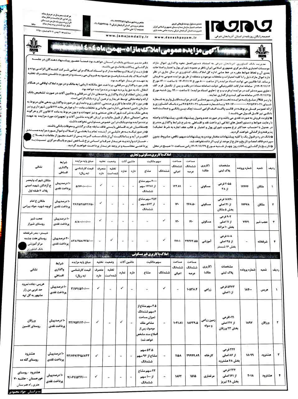 آگهي مزايده بانک کشاورزي استان آذربايجان شرقي در روزنامه جام جم به شماره 7250مورخ 1404/11/7و روزنامه آواي اقتصاد به شماره2043مورخ 1404/11/7 منتشر شده است . متقاضيان ميتوانند جهت اخذ اسناد وشرکت در مزايده به سامانه تدارکات الکترونيک دولت ( سامانه ستاد ) مراجعه نمايند